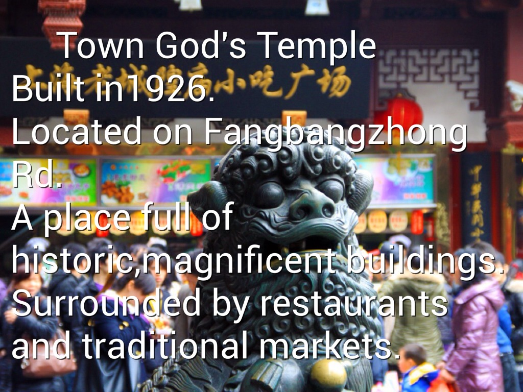 Town God's Temple Built in1926. Located on Fangbangzhong Rd. A place full of historic,magnificent buildings. Surrounded by restaurants and traditional markets.