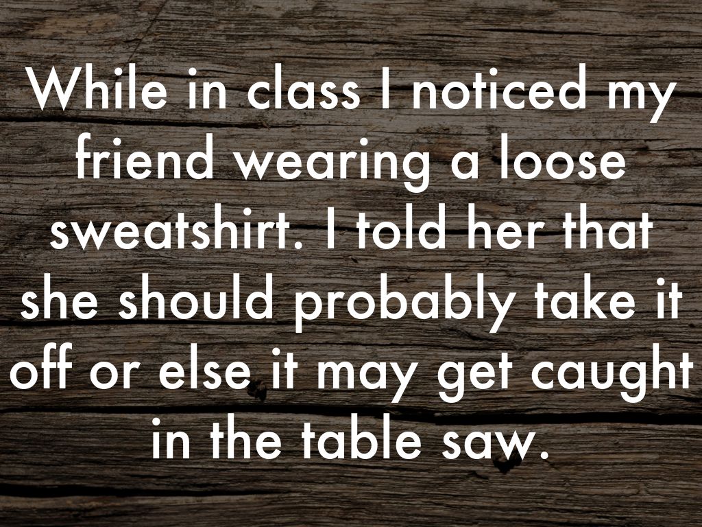 While in class I noticed my friend wearing a loose sweatshirt. I told her that she should probably take it off or else it may get caught in the table saw.