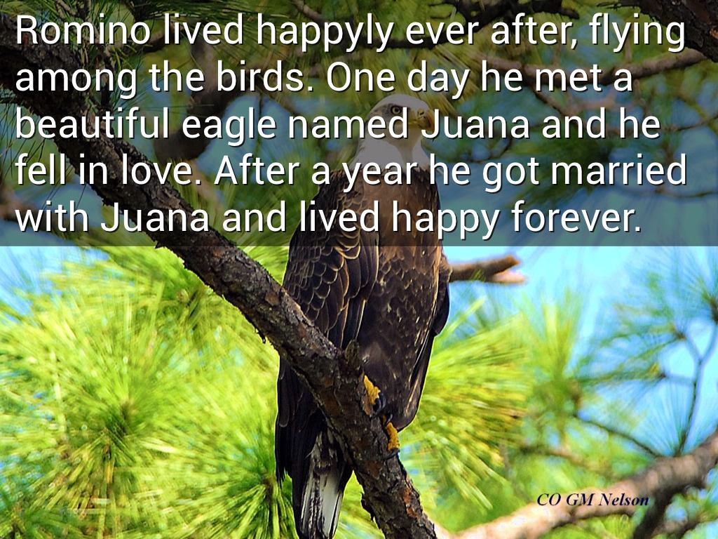 Romino lived happyly ever after, flying among the birds. One day he met a beautiful eagle named Juana and he fell in love. After a year he got married with Juana and lived happy forever.