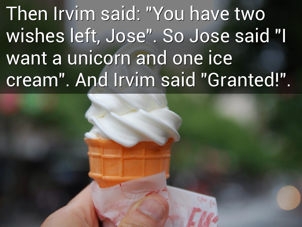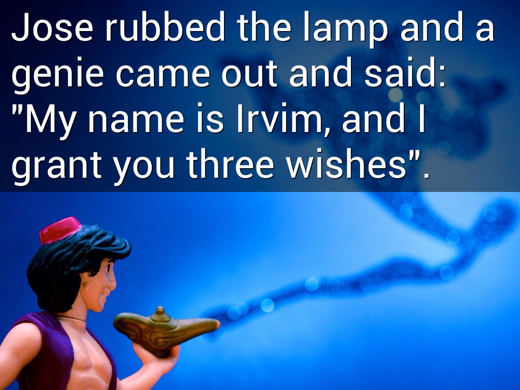 Then, Irvim said to Romino: "You have three wishes left, what do you want, Romino?". Romino started thinking and thinking and he couldn't remember what he was wishing to have.