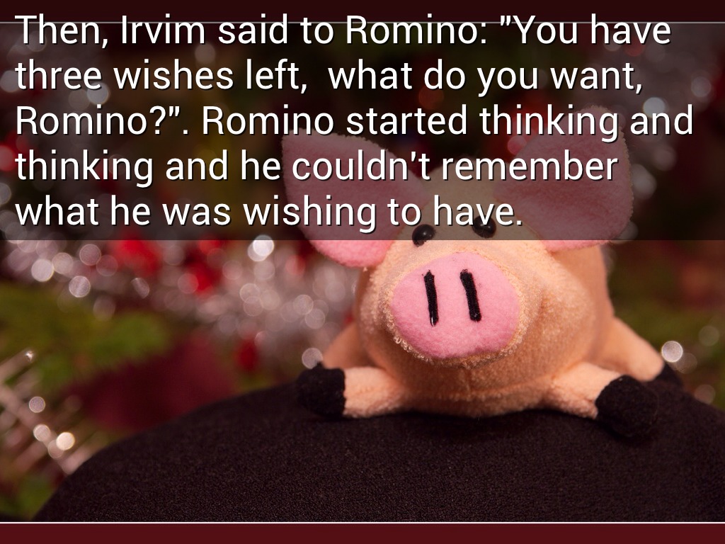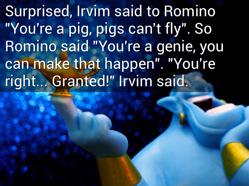 Surprised, Irvim said to Romino "You're a pig, pigs can't fly". So Romino said "You're a genie, you can make that happen". "You're right... Granted!" Irvim said.