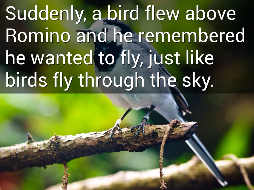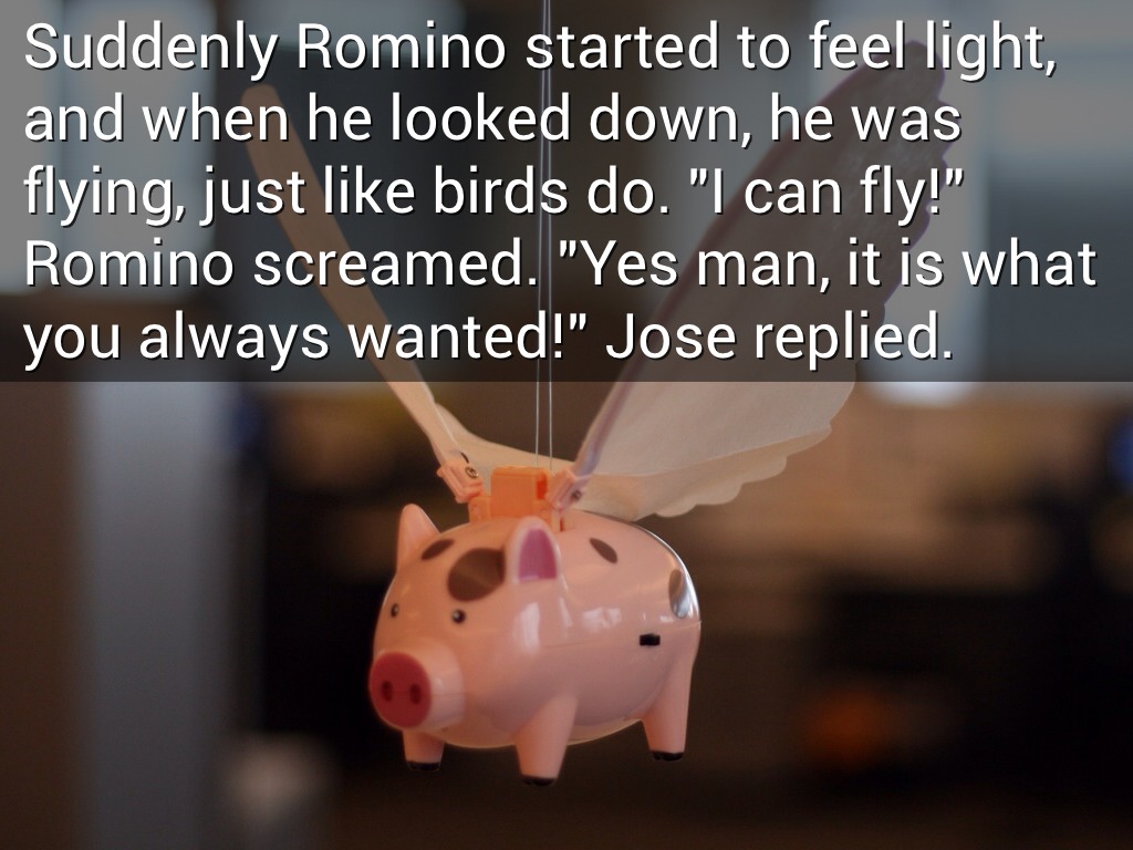 Suddenly Romino started to feel light, and when he looked down, he was flying, just like birds do. "I can fly!" Romino screamed. "Yes man, it is what you always wanted!" Jose replied.