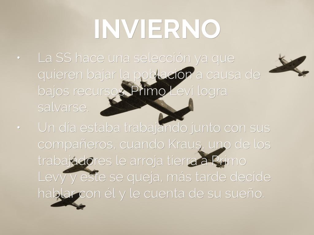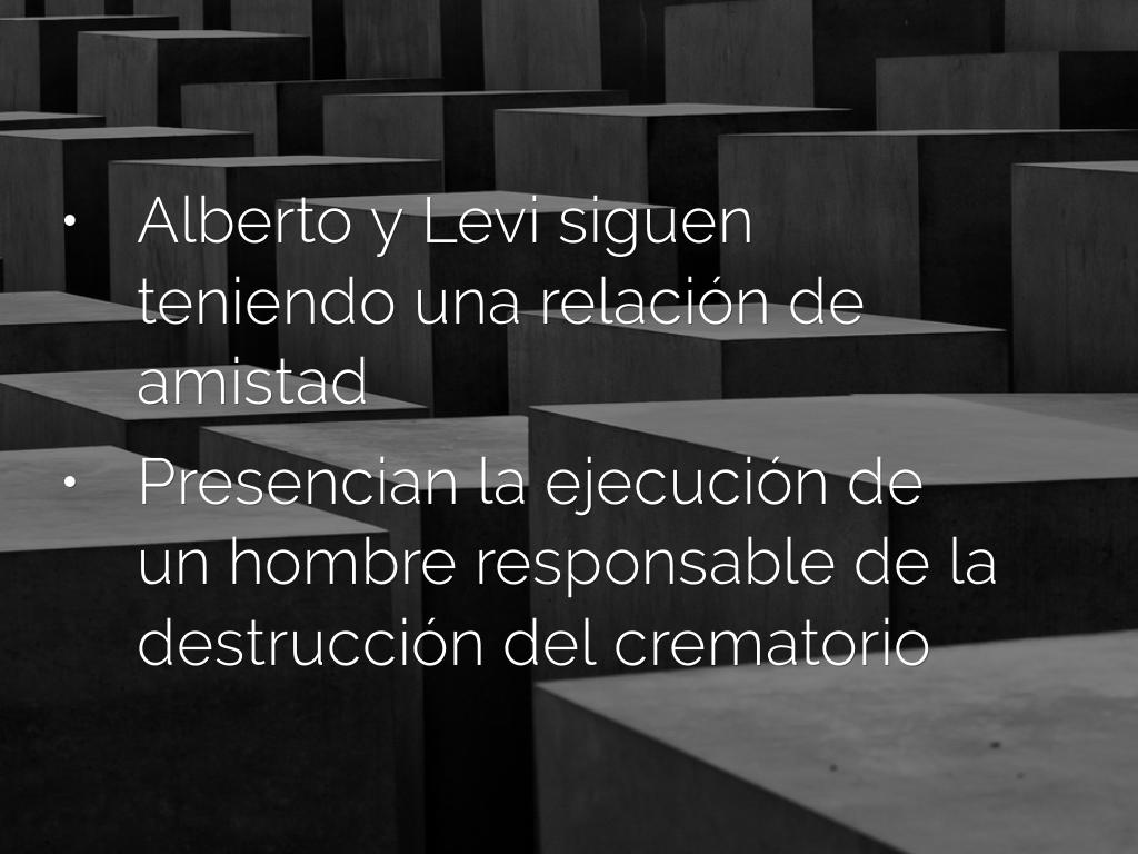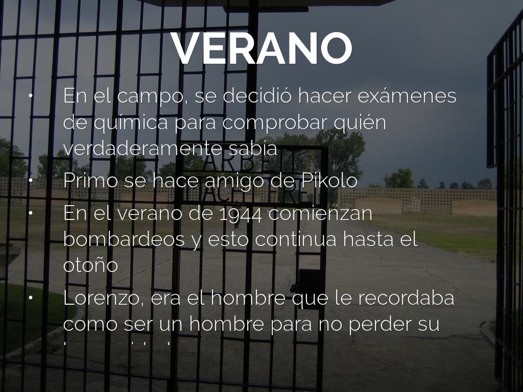Al comenzar el libro Primo Levi habla sobre como en 1943 es llevado a un campo y días mas tarde a Auschwitz. Al poco tiempo tiene que aprender las leyes de supervivencia del campo.