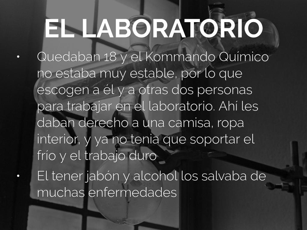 Quedaban 18 y el Kommando Químico no estaba muy estable, por lo que escogen a él y a otras dos personas para trabajar en el laboratorio. Ahí les daban derecho a una camisa, ropa interior, y ya no tenia que soportar el frío y el trabajo duro
