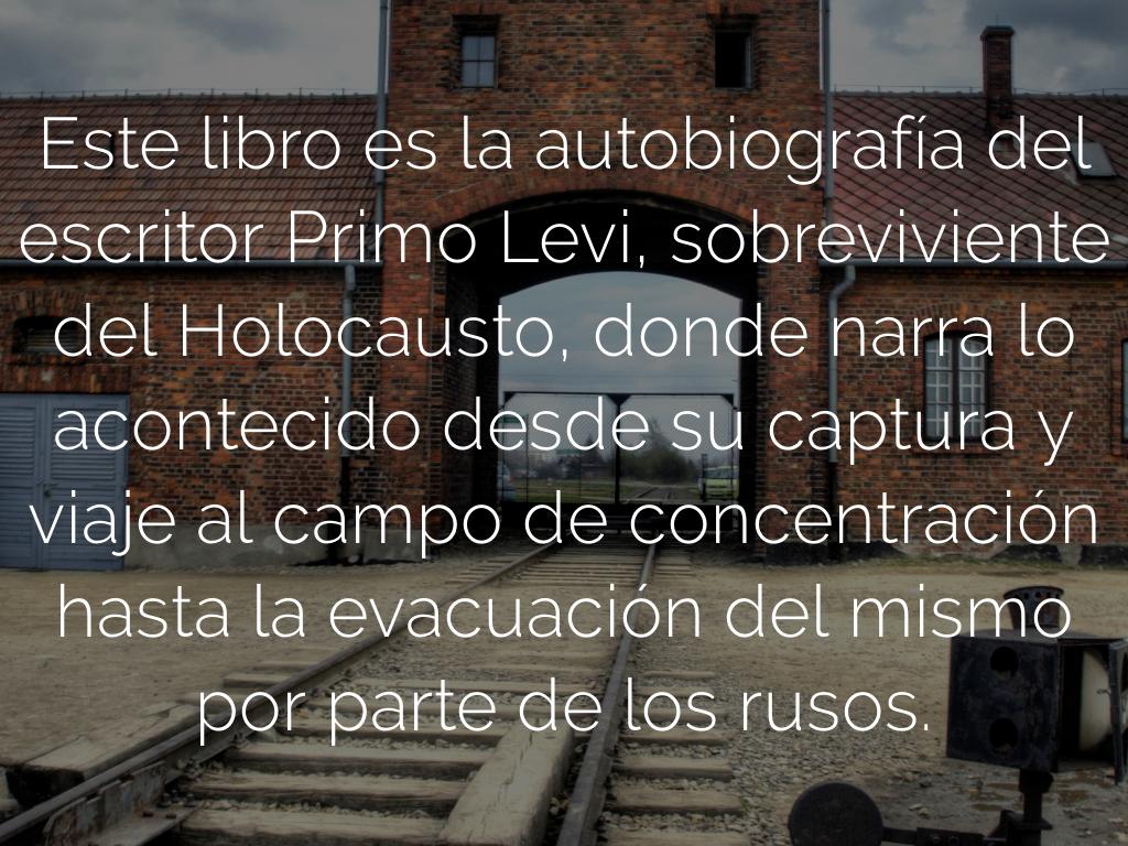 Este libro es la autobiografía del escritor Primo Levi, sobreviviente del Holocausto, donde narra lo acontecido desde su captura y viaje al campo de concentración hasta la evacuación del mismo por parte de los rusos.