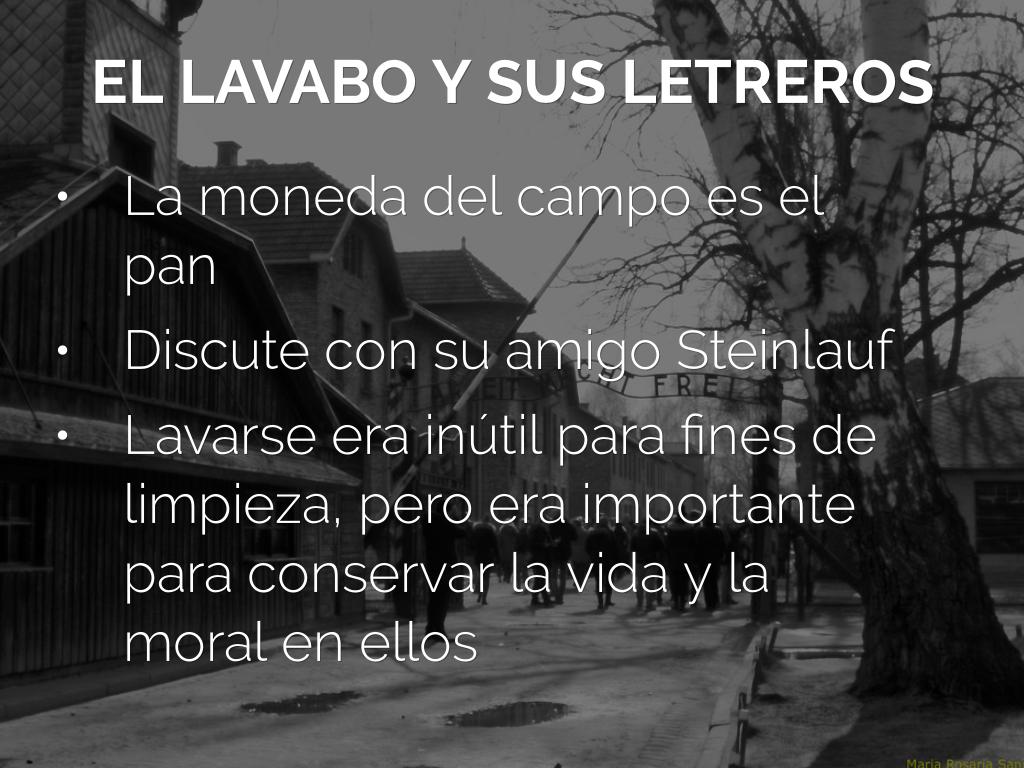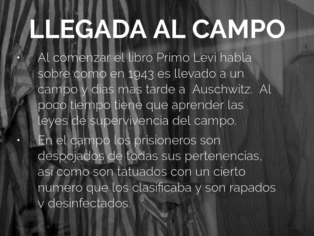 Este libro muestra detalladamente las experiencias vividas por los prisioneros de campos de concentración como Primo Levi, las condiciones en las que sobrevivían y como les quitaron todo lo que tenían, hasta su nombre, marcándolos con un número