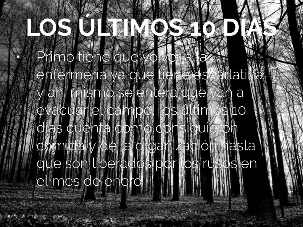 Primo tiene que volver a la enfermería ya que tiene escarlatina y ahí mismo se entera que van a evacuar el campo, los últimos 10 días cuenta como consiguieron comida y de la organización hasta que son liberados por los rusos en el mes de enero