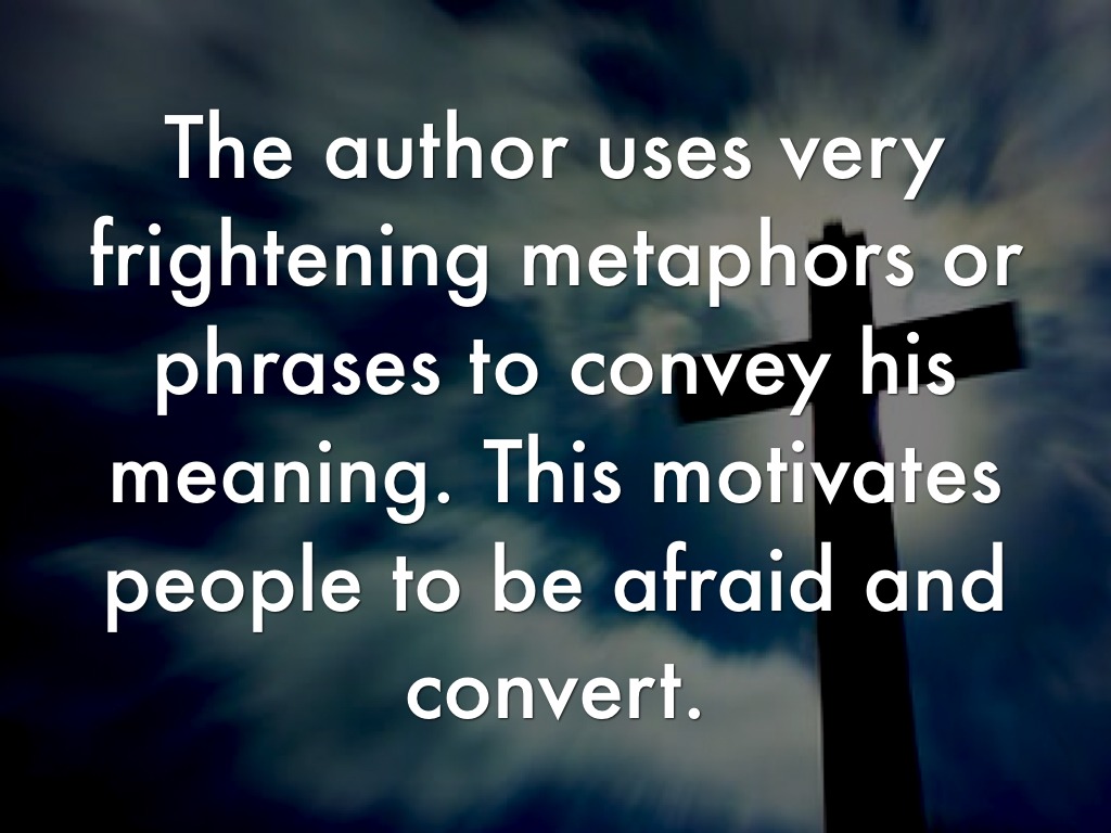 The author uses very frightening metaphors or phrases to convey his meaning. This motivates people to be afraid and convert.
