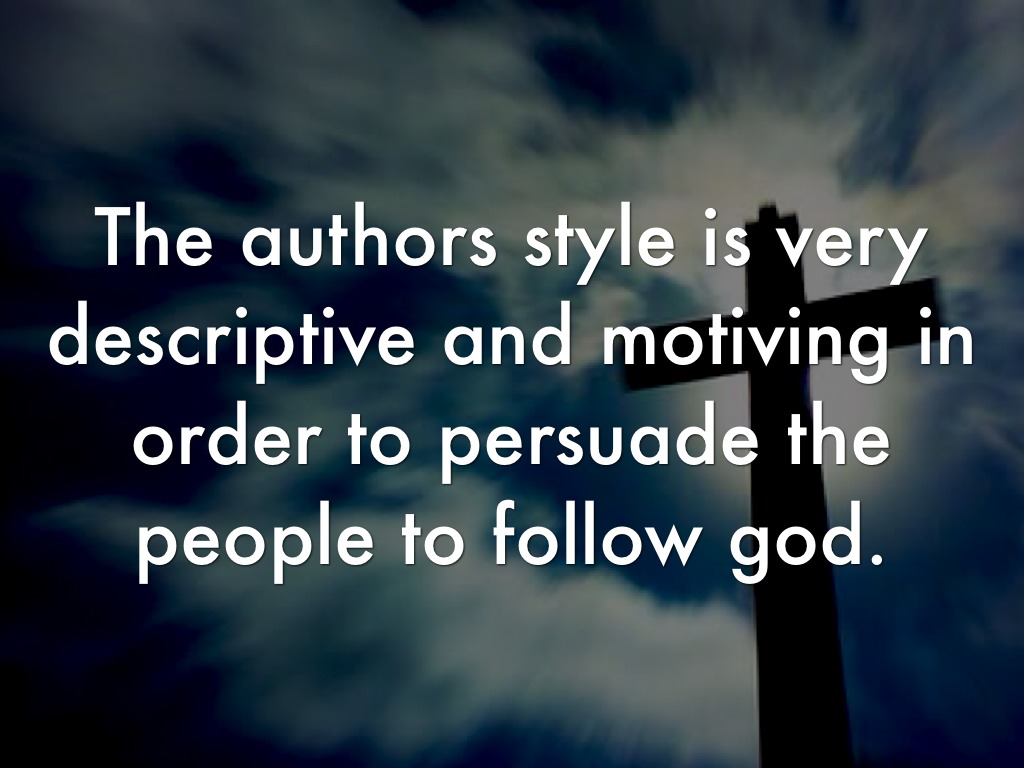 The authors style is very descriptive and motiving in order to persuade the people to follow god.