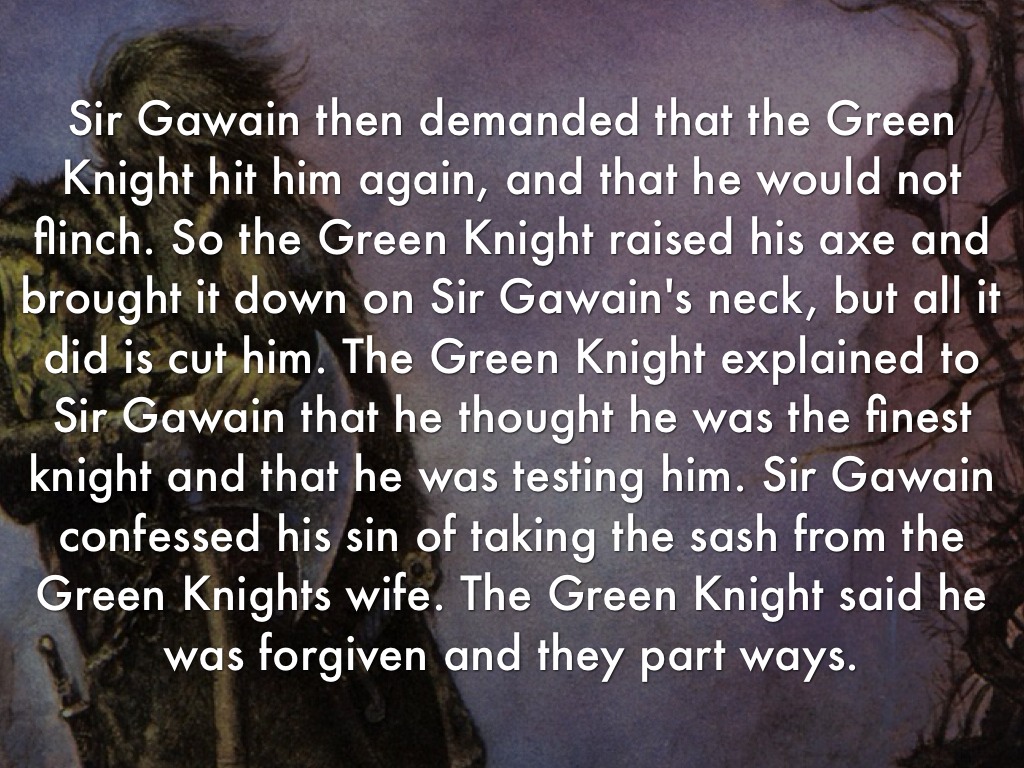 Sir Gawain then demanded that the Green Knight hit him again, and that he would not flinch. So the Green Knight raised his axe and brought it down on Sir Gawain's neck, but all it did is cut him. The Green Knight explained to Sir Gawain that he thought he was the finest knight and that he was testing him. Sir Gawain confessed his sin of taking the sash from the Green Knights wife. The Green Knight said he was forgiven and they part ways.