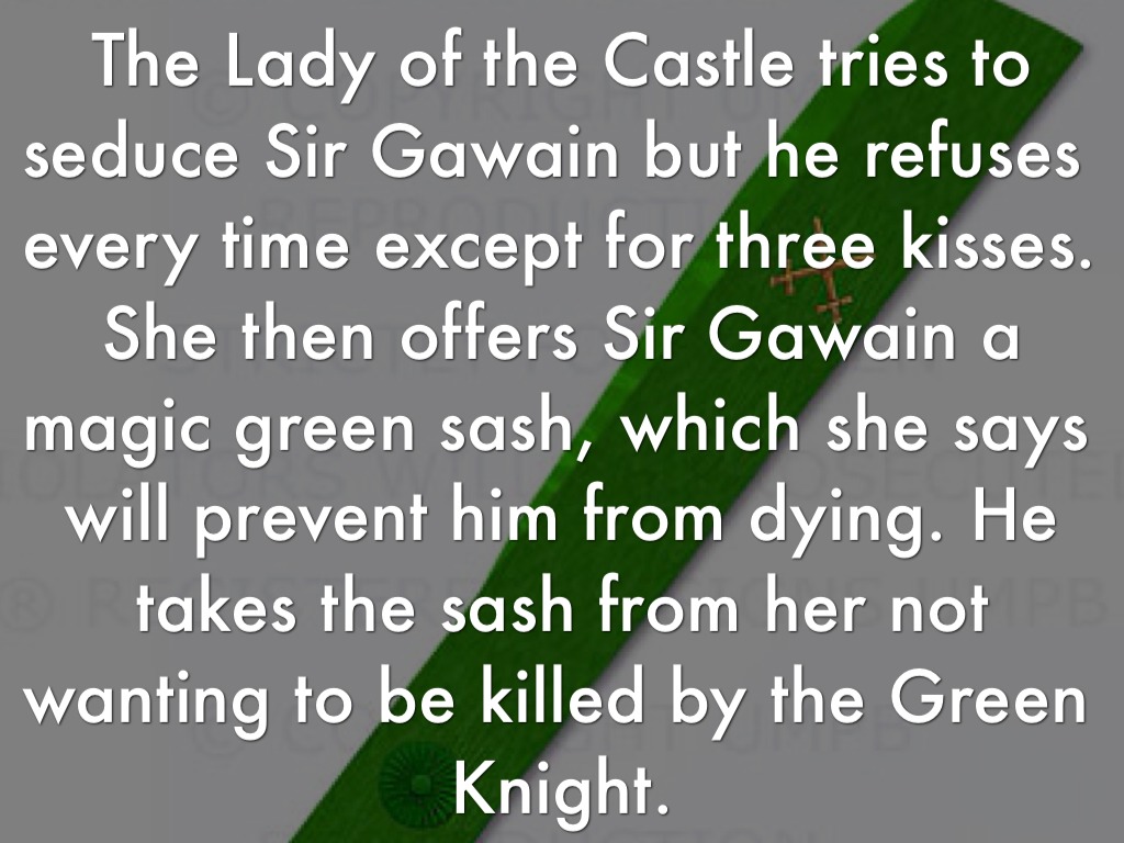 The Lady of the Castle tries to seduce Sir Gawain but he refuses every time except for three kisses. She then offers Sir Gawain a magic green sash, which she says will prevent him from dying. He takes the sash from her not wanting to be killed by the Green Knight.