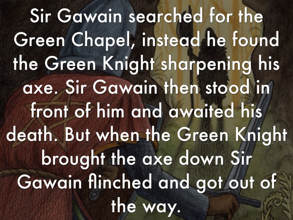 Sir Gawain searched for the Green Chapel, instead he found the Green Knight sharpening his axe. Sir Gawain then stood in front of him and awaited his death. But when the Green Knight brought the axe down Sir Gawain flinched and got out of the way.