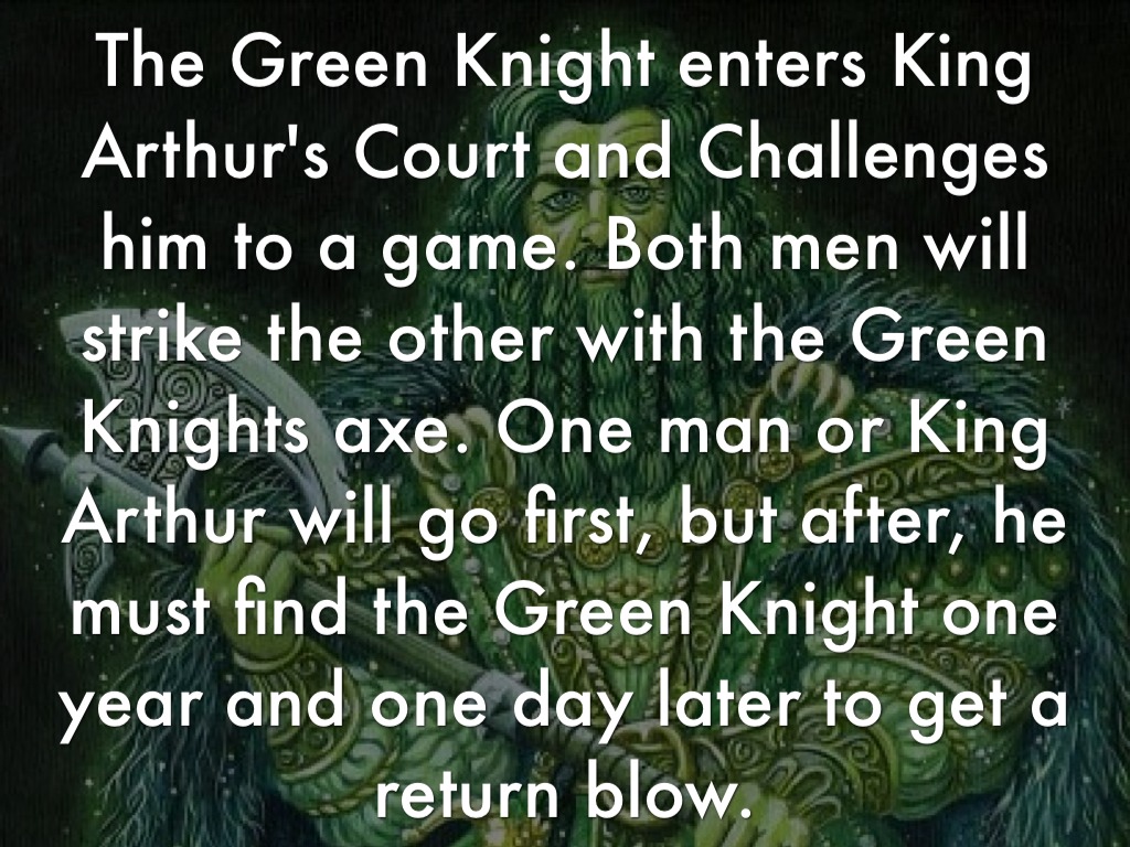 The Green Knight enters King Arthur's Court and Challenges him to a game. Both men will strike the other with the Green Knights axe. One man or King Arthur will go first, but after, he must find the Green Knight one year and one day later to get a return blow.