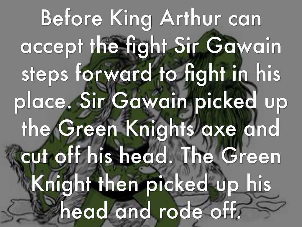 Before King Arthur can accept the fight Sir Gawain steps forward to fight in his place. Sir Gawain picked up the Green Knights axe and cut off his head. The Green Knight then picked up his head and rode off.