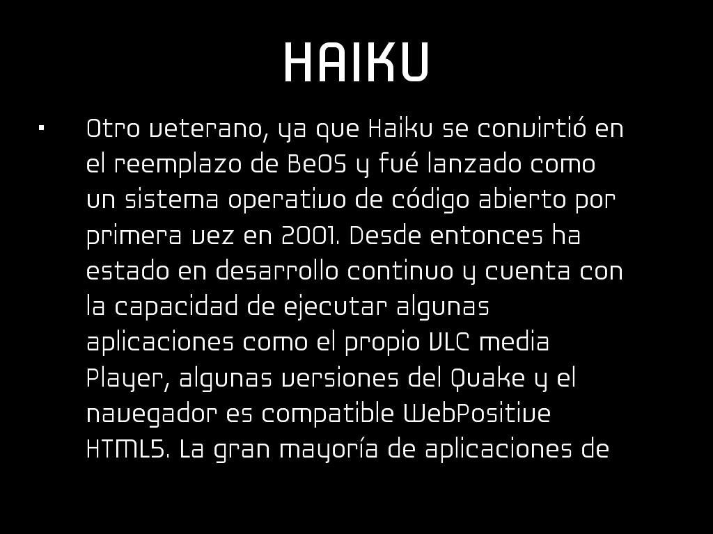 Otro veterano, ya que Haiku se convirtió en el reemplazo de BeOS y fué lanzado como un sistema operativo de código abierto por primera vez en 2001. Desde entonces ha estado en desarrollo continuo y cuenta con la capacidad de ejecutar algunas aplicaciones como el propio VLC media Player, algunas versiones del Quake y el navegador es compatible WebPositive HTML5. La gran mayoría de aplicaciones de BeOS también son compatibles con Haiku.
