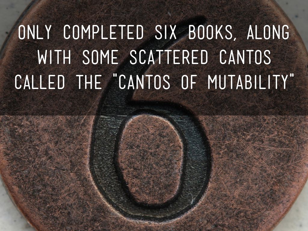 only completed six books, along with some scattered cantos called the "Cantos of Mutability"