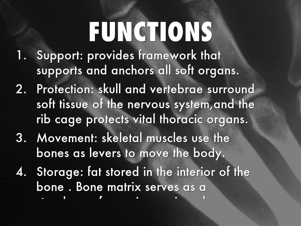 Protection: skull and vertebrae surround soft tissue of the nervous system,and the rib cage protects vital thoracic organs.