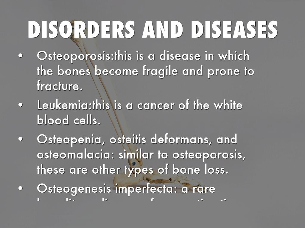 Osteopenia, osteitis deformans, and osteomalacia: similar to osteoporosis, these are other types of bone loss.