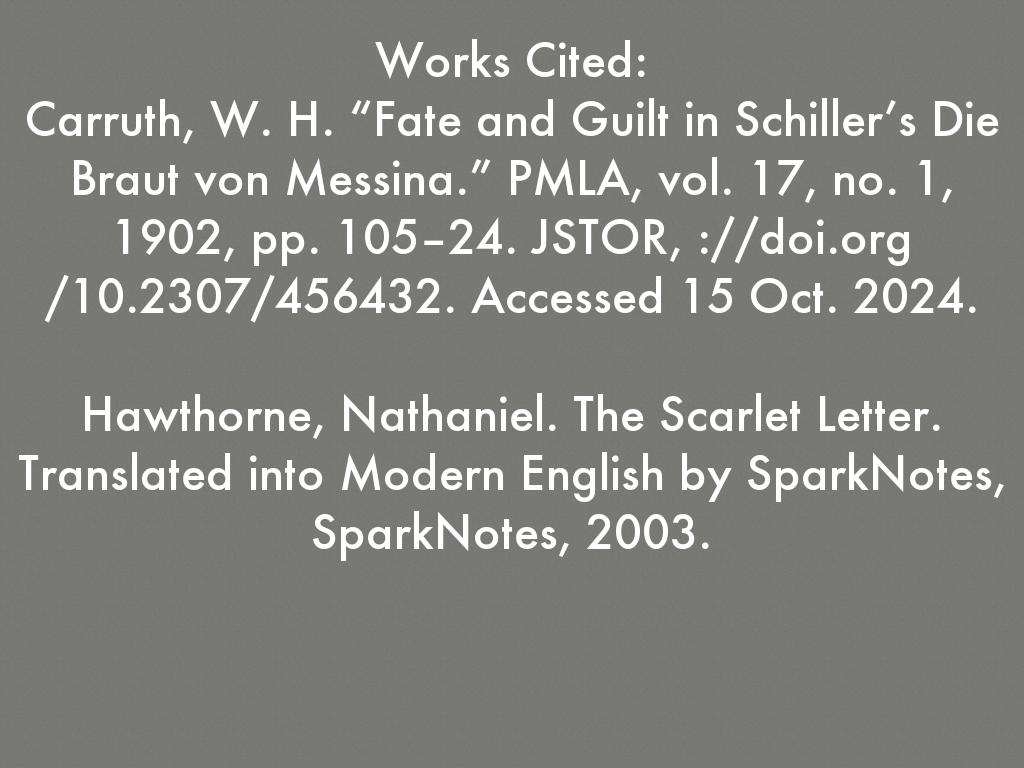 Carruth, W. H. “Fate and Guilt in Schiller’s Die Braut von Messina.” PMLA, vol. 17, no. 1, 1902, pp. 105–24. JSTOR, ://doi.org/10.2307/456432. Accessed 15 Oct. 2024.