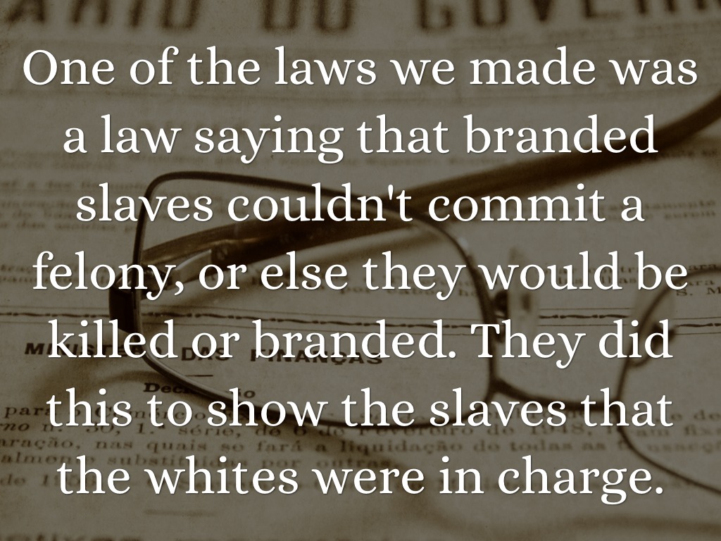 One of the laws we made was a law saying that branded slaves couldn't commit a felony, or else they would be killed or branded. They did this to show the slaves that the whites were in charge.