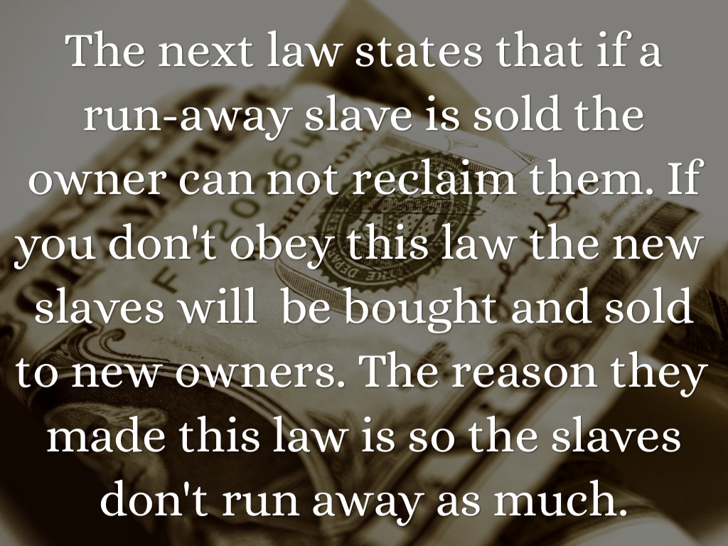 The next law states that if a run-away slave is sold the owner can not reclaim them. If you don't obey this law the new slaves will be bought and sold to new owners. The reason they made this law is so the slaves don't run away as much.