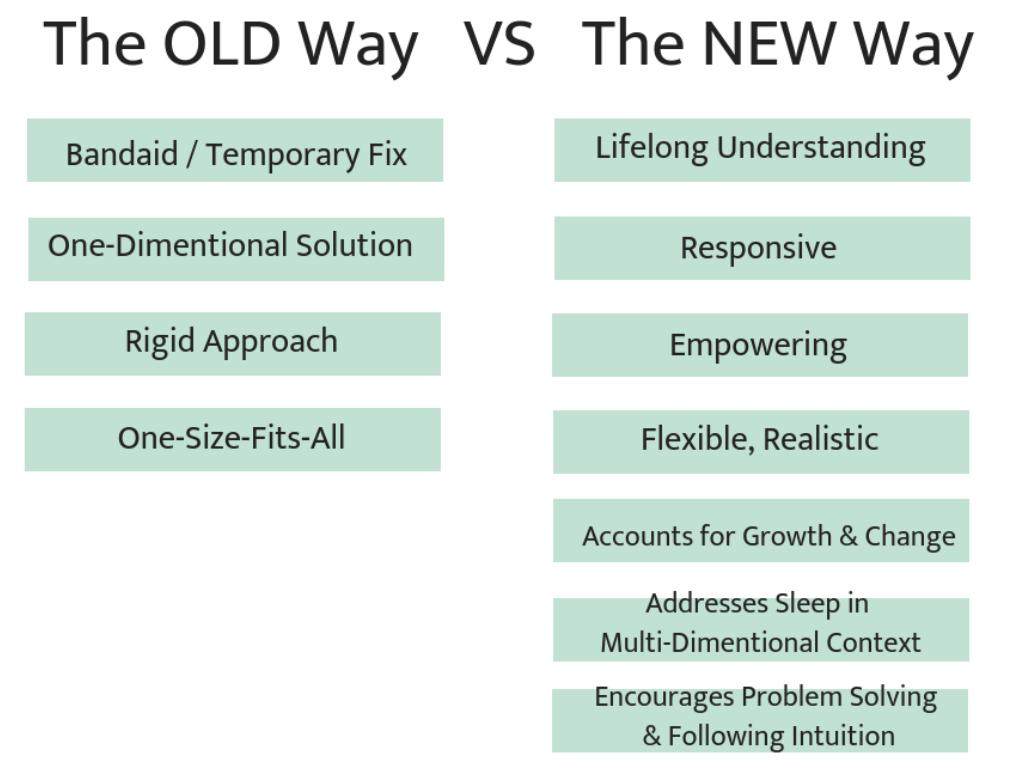 The old way offers a series of "rules" and methods that come from books, or even from sleep consultants who've been trained to provide one or two options to families. (do I want to include sleep consultants?? Don't want to piss anyone off!)