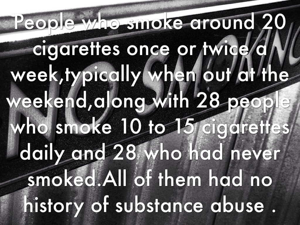 People who smoke around 20 cigarettes once or twice a week,typically when out at the weekend,along with 28 people who smoke 10 to 15 cigarettes daily and 28 who had never smoked.All of them had no history of substance abuse .