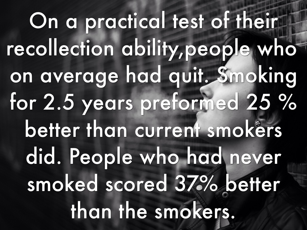 On a practical test of their recollection ability,people who on average had quit. Smoking for 2.5 years preformed 25 % better than current smokers did. People who had never smoked scored 37% better than the smokers.