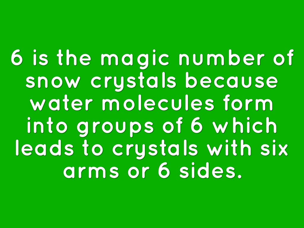 6 is the magic number of snow crystals because water molecules form into groups of 6 which leads to crystals with six arms or 6 sides.