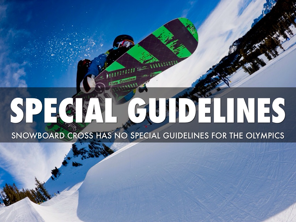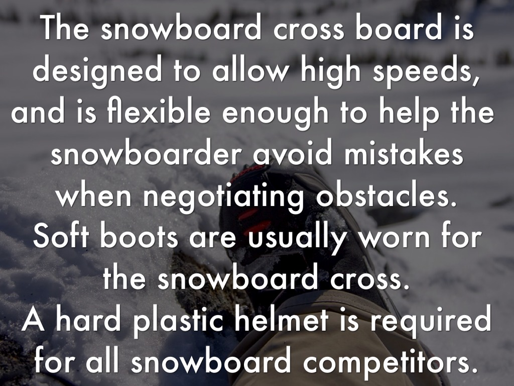 The snowboard cross board is designed to allow high speeds, and is flexible enough to help the snowboarder avoid mistakes when negotiating obstacles. Soft boots are usually worn for the snowboard cross. A hard plastic helmet is required for all snowboard competitors.