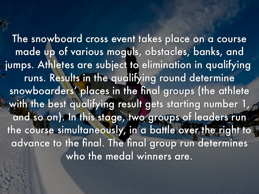 The snowboard cross event takes place on a course made up of various moguls, obstacles, banks, and jumps. Athletes are subject to elimination in qualifying runs. Results in the qualifying round determine snowboarders’ places in the final groups (the athlete with the best qualifying result gets starting number 1, and so on). In this stage, two groups of leaders run the course simultaneously, in a battle over the right to advance to the final. The final group run determines who the medal winners are.
