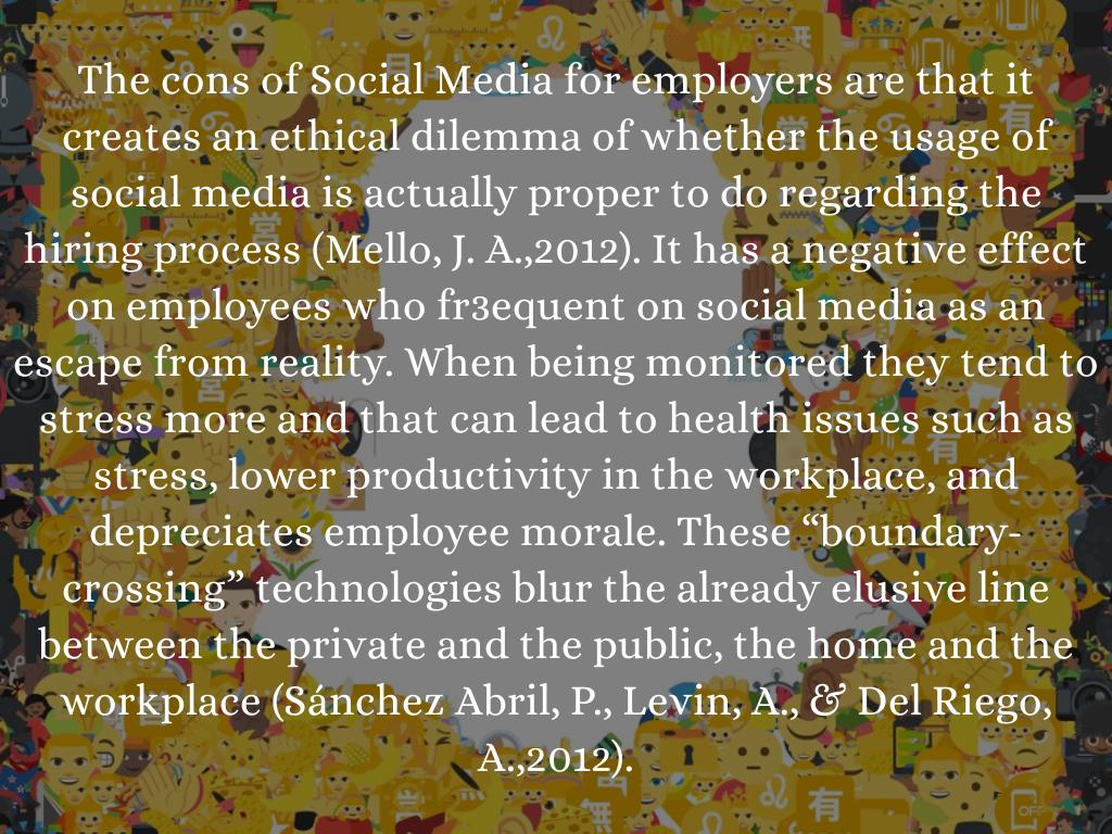 The cons of Social Media for employers are that it creates an ethical dilemma of whether the usage of social media is actually proper to do regarding the hiring process (Mello, J. A.,2012). It has a negative effect on employees who fr3equent on social media as an escape from reality. When being monitored they tend to stress more and that can lead to health issues such as stress, lower productivity in the workplace, and depreciates employee morale. These “boundary-crossing” technologies blur the already elusive line between the private and the public, the home and the workplace (Sánchez Abril, P., Levin, A., & Del Riego, A.,2012).