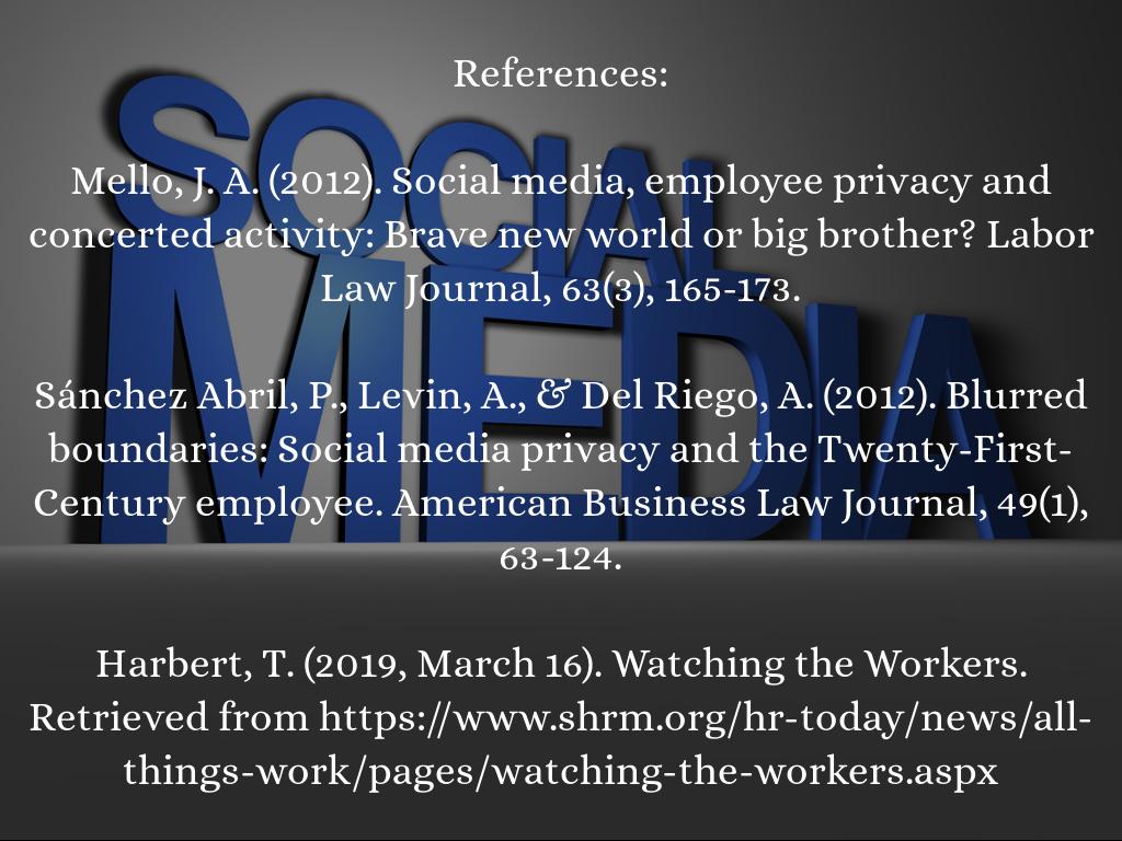 Sánchez Abril, P., Levin, A., & Del Riego, A. (2012). Blurred boundaries: Social media privacy and the Twenty-First-Century employee. American Business Law Journal, 49(1), 63-124.