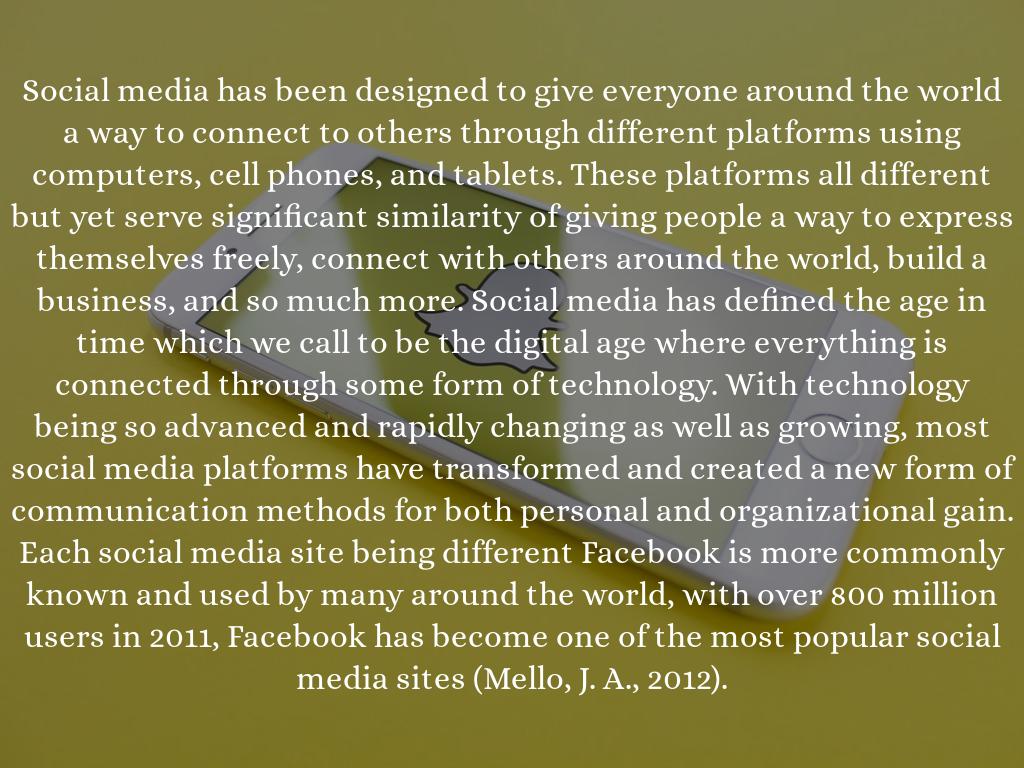 Social media has been designed to give everyone around the world a way to connect to others through different platforms using computers, cell phones, and tablets. These platforms all different but yet serve significant similarity of giving people a way to express themselves freely, connect with others around the world, build a business, and so much more. Social media has defined the age in time which we call to be the digital age where everything is connected through some form of technology. With technology being so advanced and rapidly changing as well as growing, most social media platforms have transformed and created a new form of communication methods for both personal and organizational gain. Each social media site being different Facebook is more commonly known and used by many around the world, with over 800 million users in 2011, Facebook has become one of the most popular social media sites (Mello, J. A., 2012).