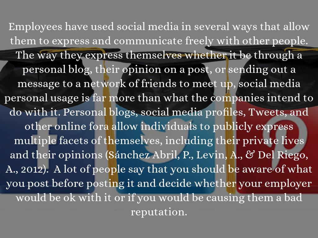 Employees have used social media in several ways that allow them to express and communicate freely with other people. The way they express themselves whether it be through a personal blog, their opinion on a post, or sending out a message to a network of friends to meet up, social media personal usage is far more than what the companies intend to do with it. Personal blogs, social media profiles, Tweets, and other online fora allow individuals to publicly express multiple facets of themselves, including their private lives and their opinions (Sánchez Abril, P., Levin, A., & Del Riego, A., 2012). A lot of people say that you should be aware of what you post before posting it and decide whether your employer would be ok with it or if you would be causing them a bad reputation.