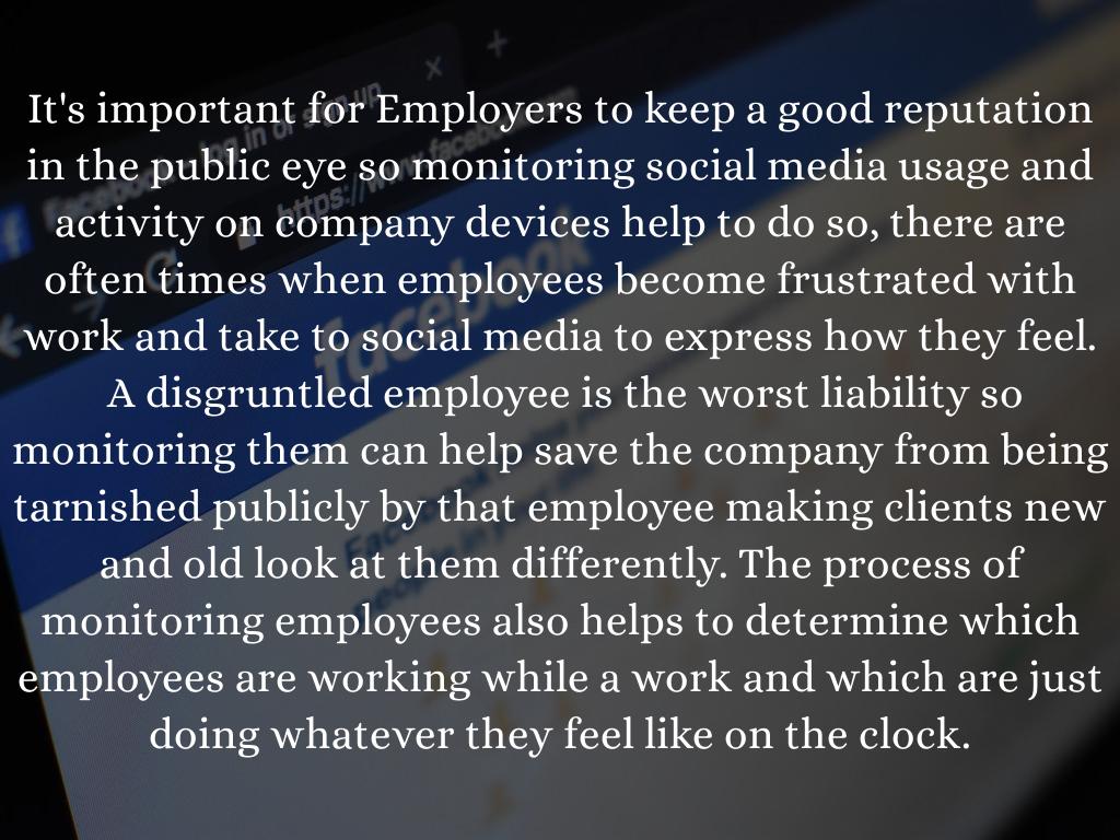 It's important for Employers to keep a good reputation in the public eye so monitoring social media usage and activity on company devices help to do so, there are often times when employees become frustrated with work and take to social media to express how they feel. A disgruntled employee is the worst liability so monitoring them can help save the company from being tarnished publicly by that employee making clients new and old look at them differently. The process of monitoring employees also helps to determine which employees are working while a work and which are just doing whatever they feel like on the clock.