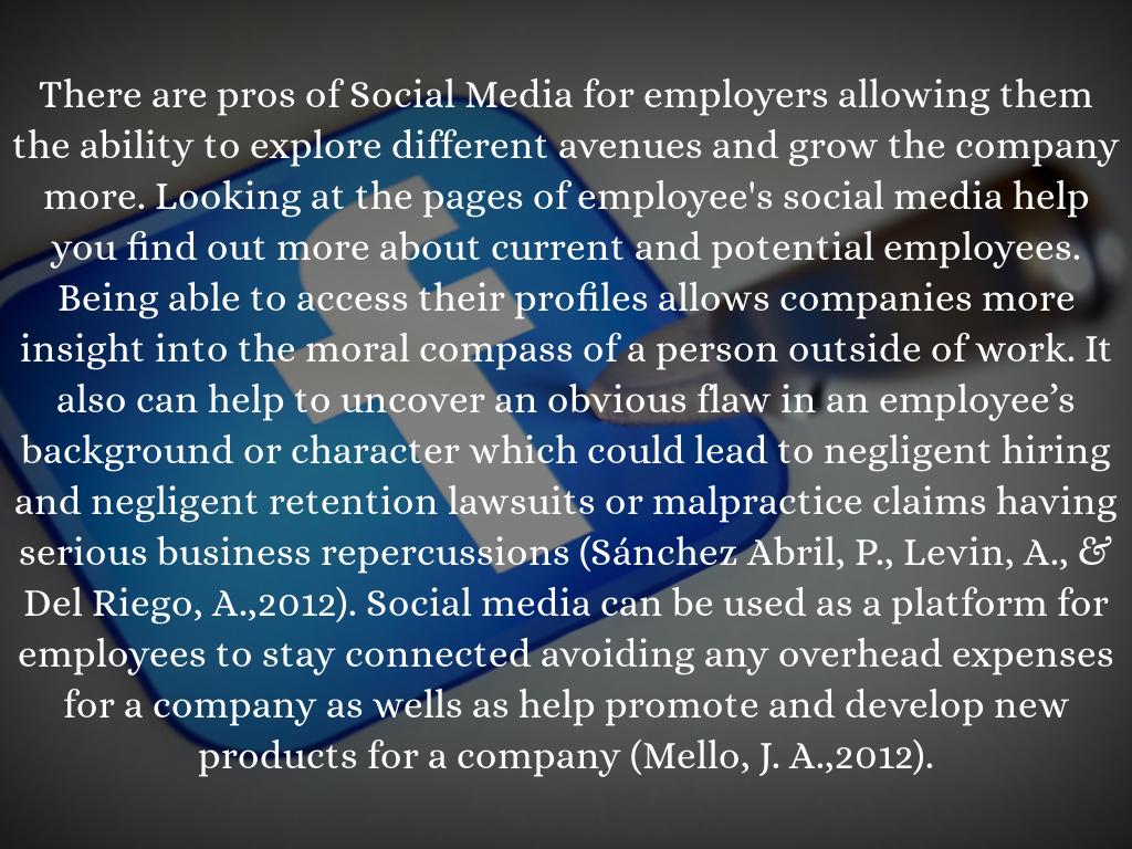 There are pros of Social Media for employers allowing them the ability to explore different avenues and grow the company more. Looking at the pages of employee's social media help you find out more about current and potential employees. Being able to access their profiles allows companies more insight into the moral compass of a person outside of work. It also can help to uncover an obvious flaw in an employee’s background or character which could lead to negligent hiring and negligent retention lawsuits or malpractice claims having serious business repercussions (Sánchez Abril, P., Levin, A., & Del Riego, A.,2012). Social media can be used as a platform for employees to stay connected avoiding any overhead expenses for a company as wells as help promote and develop new products for a company (Mello, J. A.,2012).