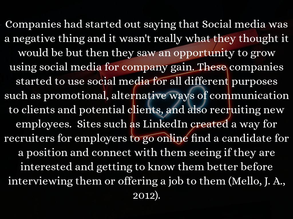 Companies had started out saying that Social media was a negative thing and it wasn't really what they thought it would be but then they saw an opportunity to grow using social media for company gain. These companies started to use social media for all different purposes such as promotional, alternative ways of communication to clients and potential clients, and also recruiting new employees. Sites such as LinkedIn created a way for recruiters for employers to go online find a candidate for a position and connect with them seeing if they are interested and getting to know them better before interviewing them or offering a job to them (Mello, J. A., 2012).