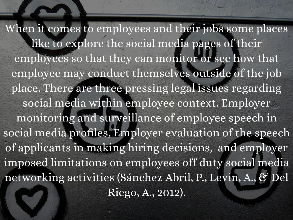 When it comes to employees and their jobs some places like to explore the social media pages of their employees so that they can monitor or see how that employee may conduct themselves outside of the job place. There are three pressing legal issues regarding social media within employee context. Employer monitoring and surveillance of employee speech in social media profiles, Employer evaluation of the speech of applicants in making hiring decisions, and employer imposed limitations on employees off duty social media networking activities (Sánchez Abril, P., Levin, A., & Del Riego, A., 2012).