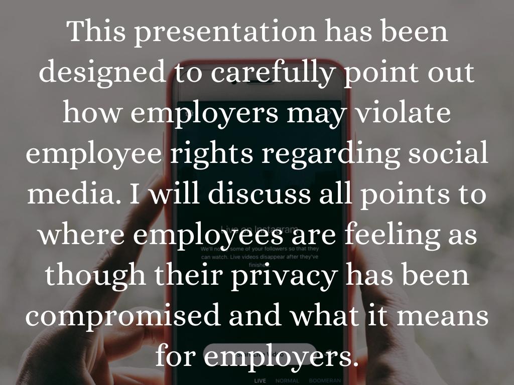 This presentation has been designed to carefully point out how employers may violate employee rights regarding social media. I will discuss all points to where employees are feeling as though their privacy has been compromised and what it means for employers.