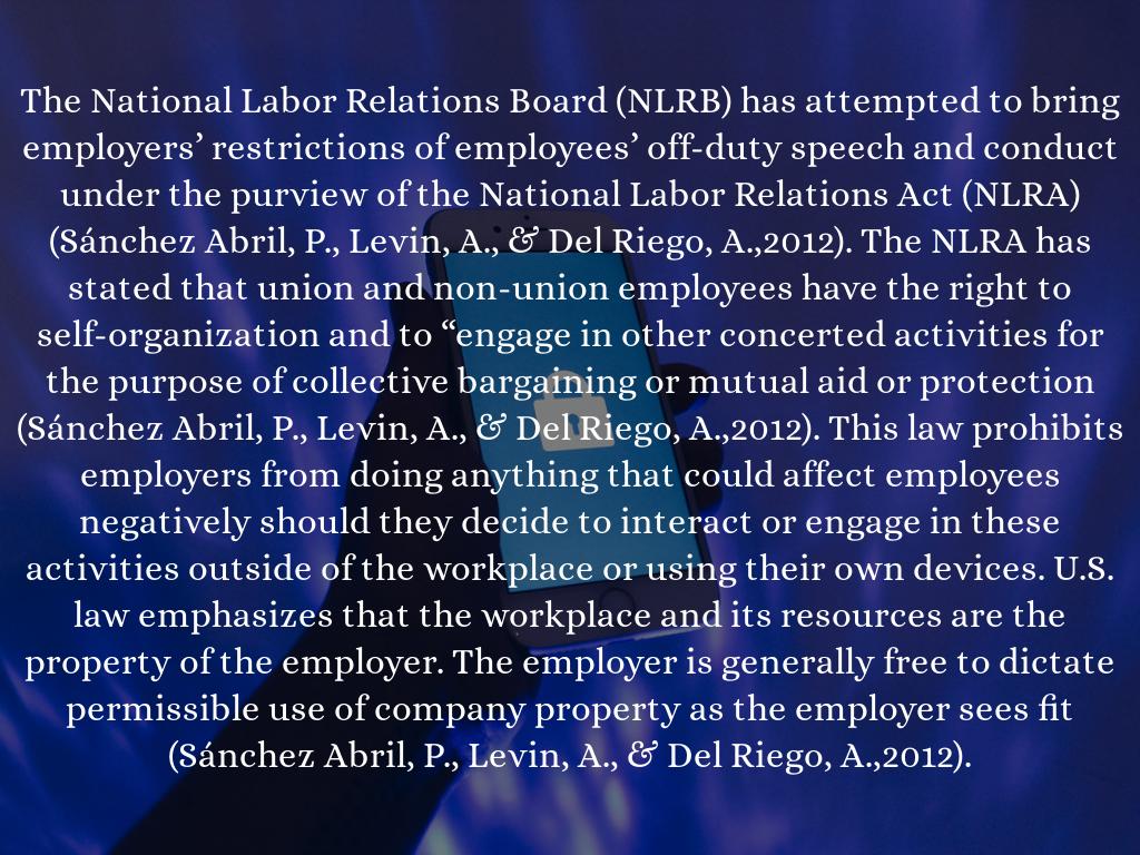 The National Labor Relations Board (NLRB) has attempted to bring employers’ restrictions of employees’ off-duty speech and conduct under the purview of the National Labor Relations Act (NLRA) (Sánchez Abril, P., Levin, A., & Del Riego, A.,2012). The NLRA has stated that union and non-union employees have the right to self-organization and to “engage in other concerted activities for the purpose of collective bargaining or mutual aid or protection (Sánchez Abril, P., Levin, A., & Del Riego, A.,2012). This law prohibits employers from doing anything that could affect employees negatively should they decide to interact or engage in these activities outside of the workplace or using their own devices. U.S. law emphasizes that the workplace and its resources are the property of the employer. The employer is generally free to dictate permissible use of company property as the employer sees fit (Sánchez Abril, P., Levin, A., & Del Riego, A.,2012).