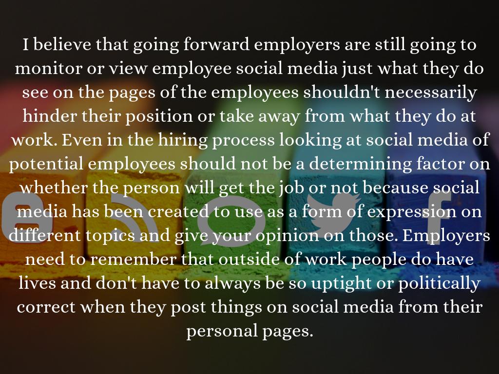 I believe that going forward employers are still going to monitor or view employee social media just what they do see on the pages of the employees shouldn't necessarily hinder their position or take away from what they do at work. Even in the hiring process looking at social media of potential employees should not be a determining factor on whether the person will get the job or not because social media has been created to use as a form of expression on different topics and give your opinion on those. Employers need to remember that outside of work people do have lives and don't have to always be so uptight or politically correct when they post things on social media from their personal pages.