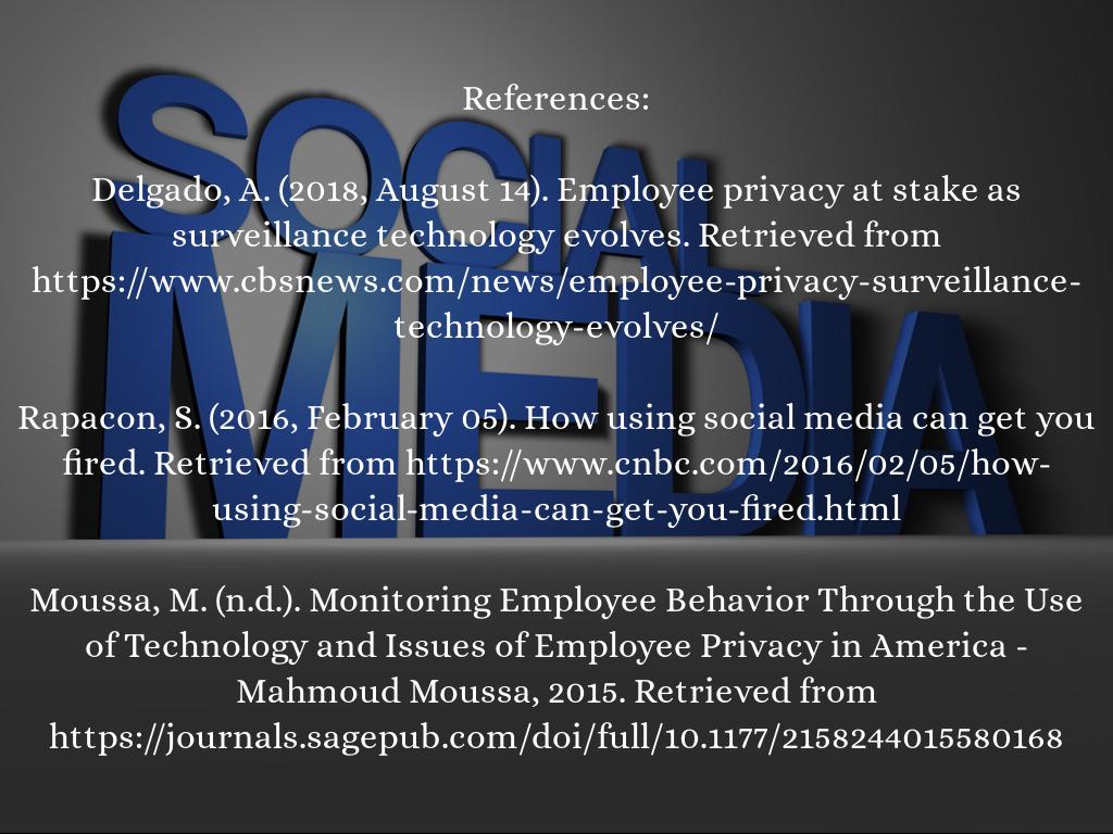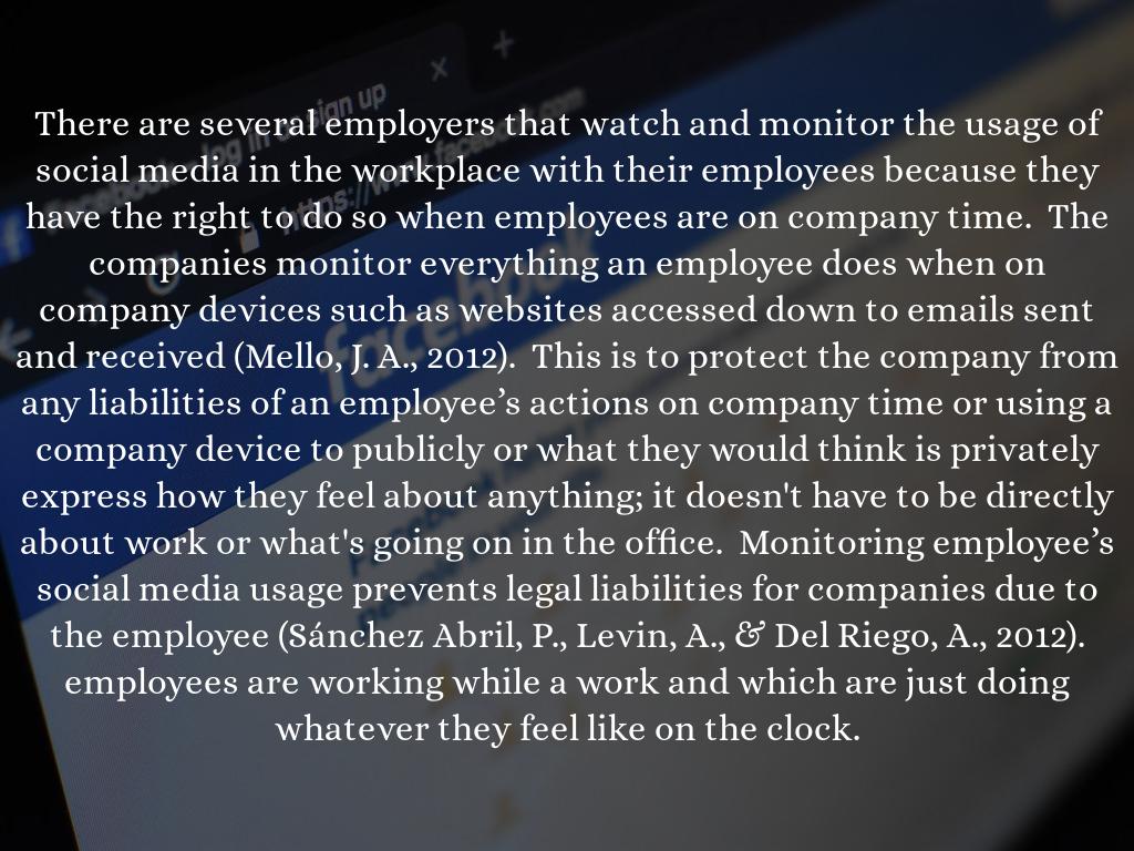 There are several employers that watch and monitor the usage of social media in the workplace with their employees because they have the right to do so when employees are on company time. The companies monitor everything an employee does when on company devices such as websites accessed down to emails sent and received (Mello, J. A., 2012). This is to protect the company from any liabilities of an employee’s actions on company time or using a company device to publicly or what they would think is privately express how they feel about anything; it doesn't have to be directly about work or what's going on in the office. Monitoring employee’s social media usage prevents legal liabilities for companies due to the employee (Sánchez Abril, P., Levin, A., & Del Riego, A., 2012). employees are working while a work and which are just doing whatever they feel like on the clock.