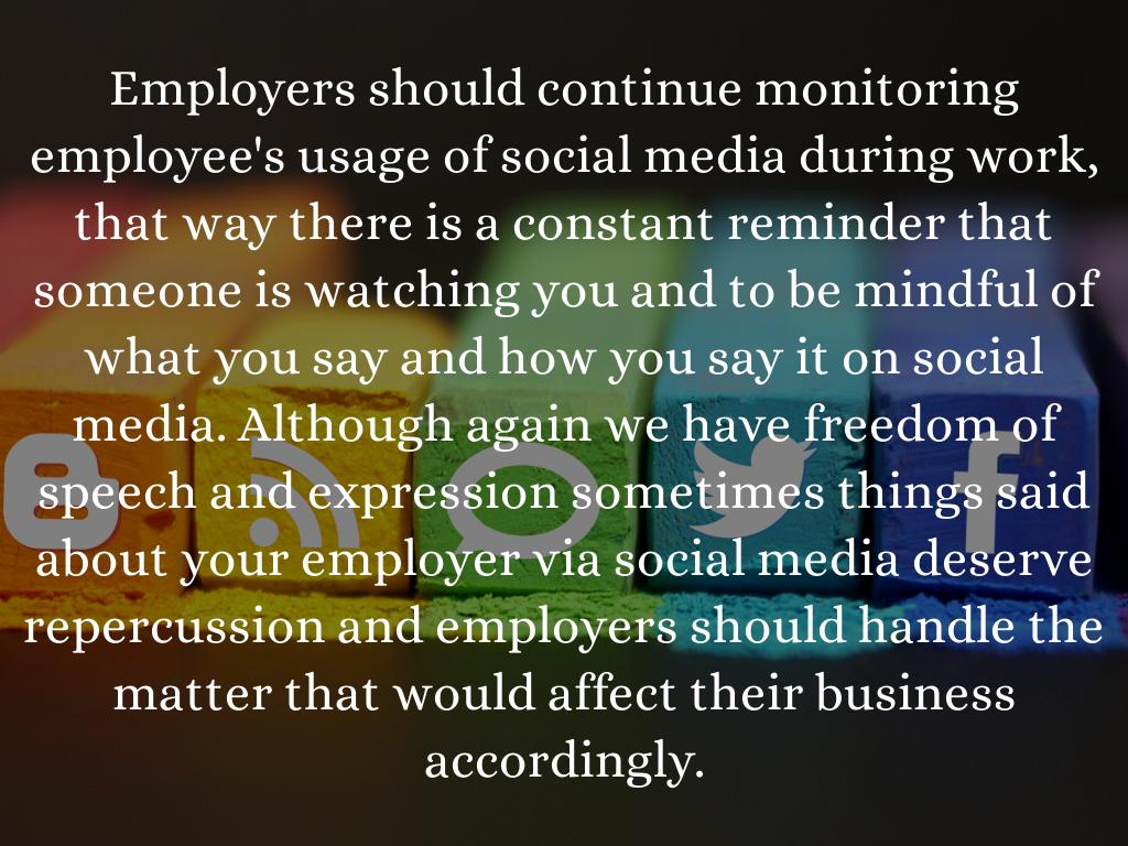 Employers should continue monitoring employee's usage of social media during work, that way there is a constant reminder that someone is watching you and to be mindful of what you say and how you say it on social media. Although again we have freedom of speech and expression sometimes things said about your employer via social media deserve repercussion and employers should handle the matter that would affect their business accordingly.