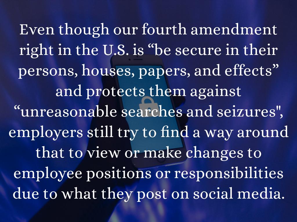Even though our fourth amendment right in the U.S. is “be secure in their persons, houses, papers, and effects” and protects them against “unreasonable searches and seizures", employers still try to find a way around that to view or make changes to employee positions or responsibilities due to what they post on social media.