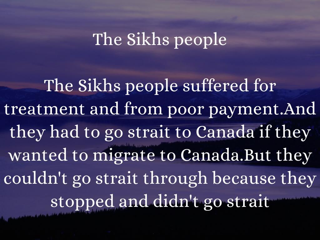 The Sikhs people suffered for treatment and from poor payment.And they had to go strait to Canada if they wanted to migrate to Canada.But they couldn't go strait through because they stopped and didn't go strait