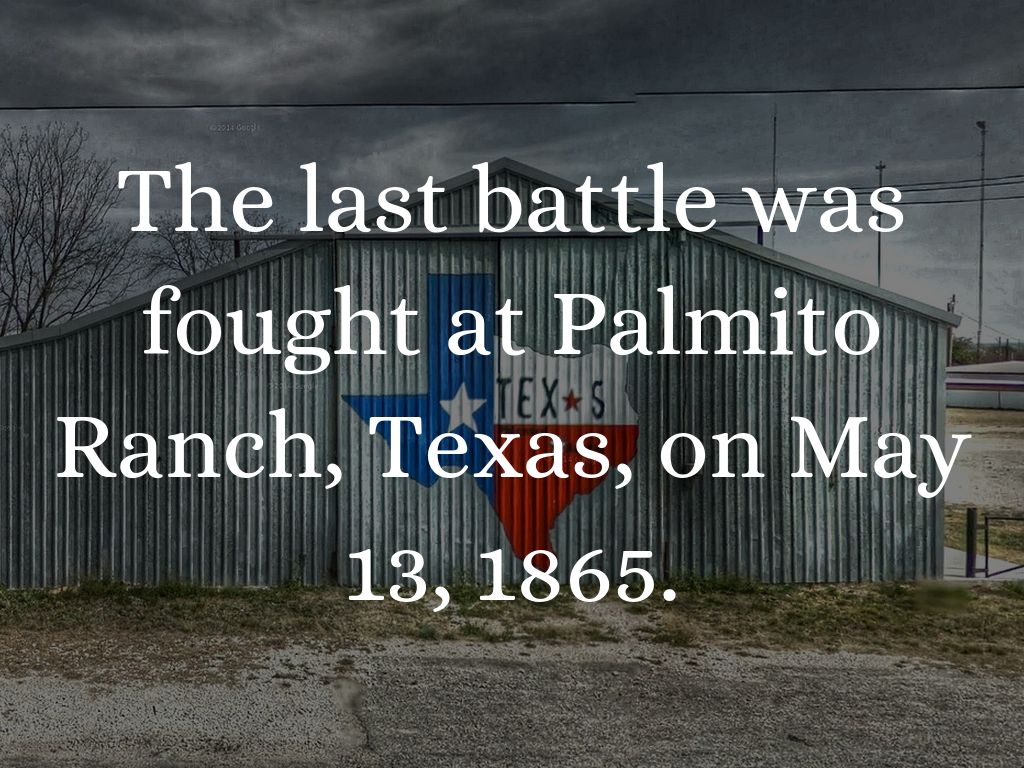 The last battle was fought at Palmito Ranch, Texas, on May 13, 1865.