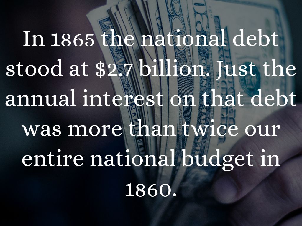 In 1865 the national debt stood at $2.7 billion. Just the annual interest on that debt was more than twice our entire national budget in 1860.