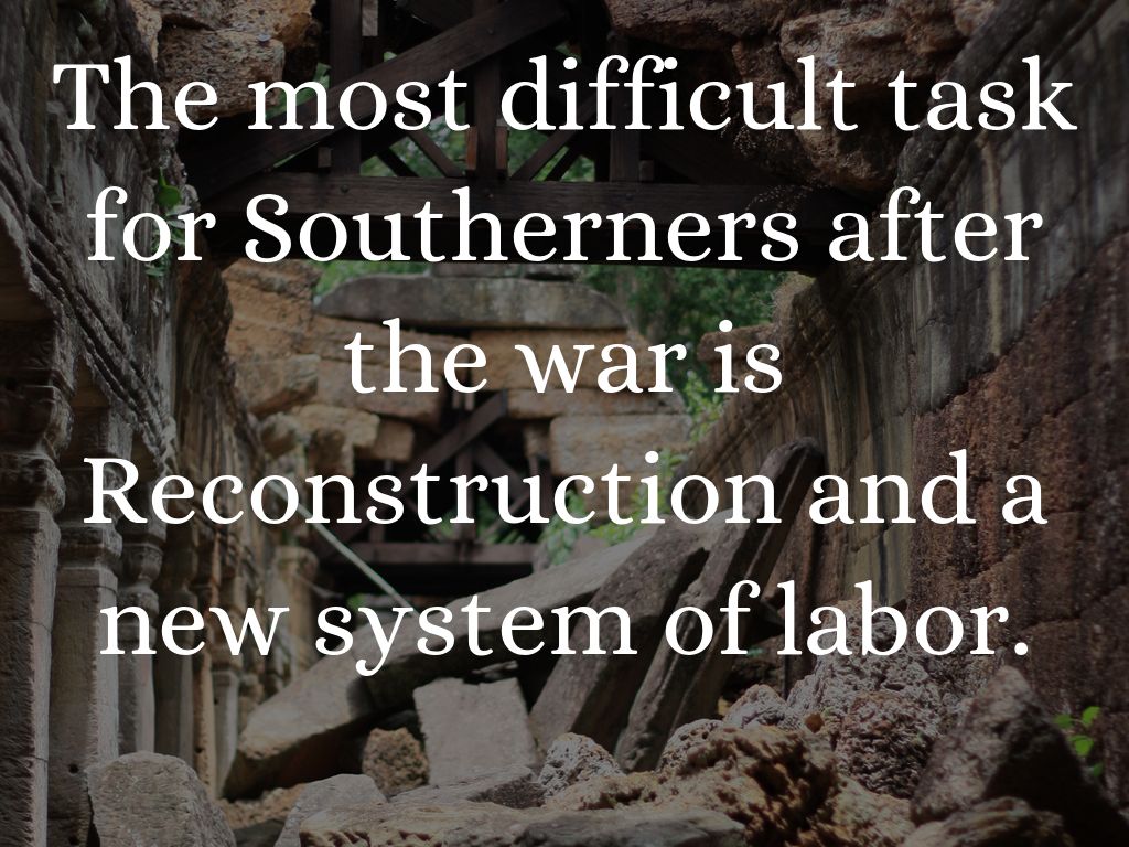 The most difficult task for Southerners after the war is Reconstruction and a new system of labor.