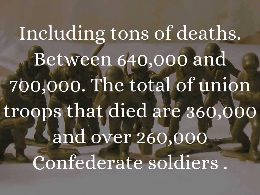 Including tons of deaths. Between 640,000 and 700,000. The total of union troops that died are 360,000 and over 260,000 Confederate soldiers .